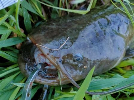 ナマズらしい捕食音、フッキングが決まり大暴れ