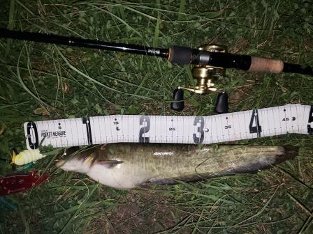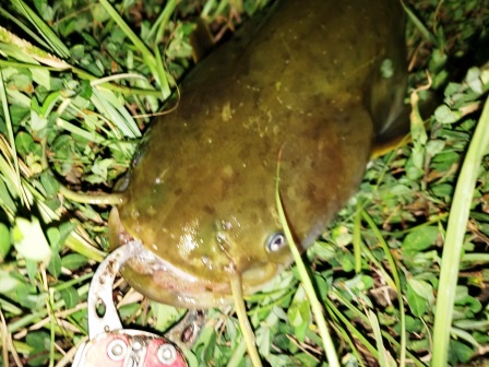 その後、蚊に襲われながら釣っていると、岸際にキャストしたスミス キャタピー クリッカー (ナマズ専用ルアー)に落ちパク
