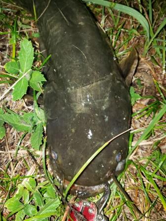 フッキングも決まりバシャバシャと激しく暴れるナマズを寄せて抜き揚げ