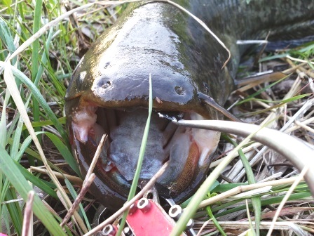 太いナマズががっぷりと食いついているのでリアフックが奥の方に掛かっているからライギョ用の【スミス SMITH】スミス SMITH グロッサ メタリCDXを使って口を開きます。