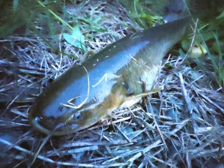 フッキングが決まり暴れるナマズをやっと水揚げできました