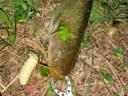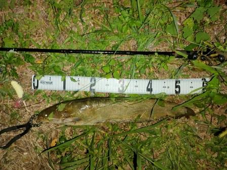 お帰りいただき、暗いので夜光テープチューンしたスミス キャタピー クリッカー (ナマズ専用ルアー)で帰り道探ってみると、2バイトあったがフッキングせず( ノД`)