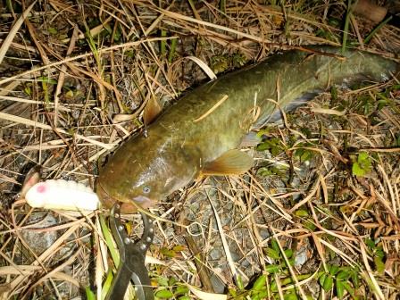 アワセが決まり暴れるナマズを寄せて抜き揚げ