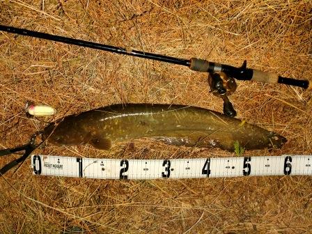 小さめのバイトでルアーが沈む。フッキングが決まり暴れまくるナマズを寄せて抜き揚げ。