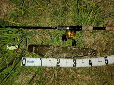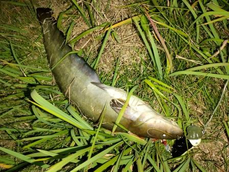 やっとフッキングが決まり、暴れるナマズを寄せて抜き揚げ