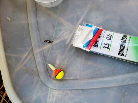 仕掛けは2.7mの振出し竿(安物)、道糸は0.8号のナイロン、玉ウキにヨリモドシ、ハリは袖にしてみます。
