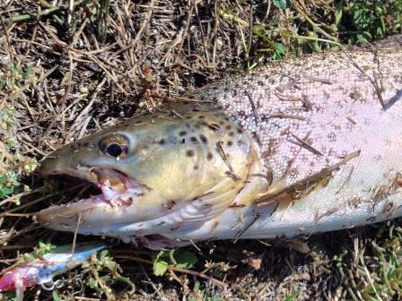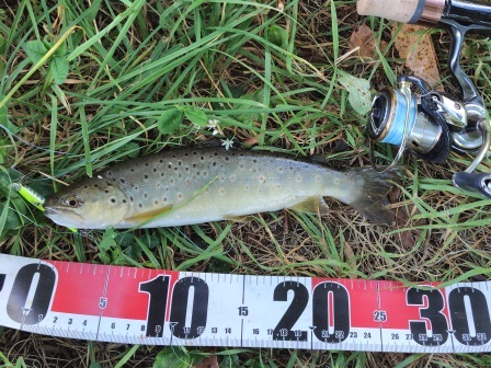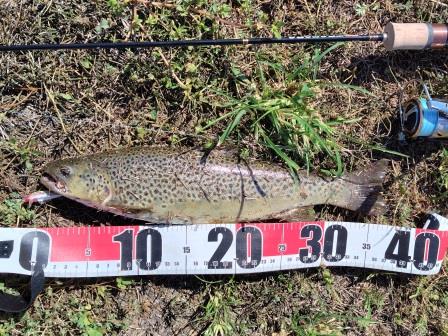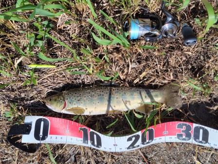小さな橋の下でアクションをつけていたら茶色い魚がチェイス!