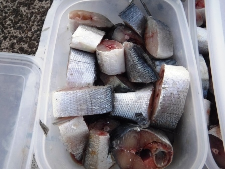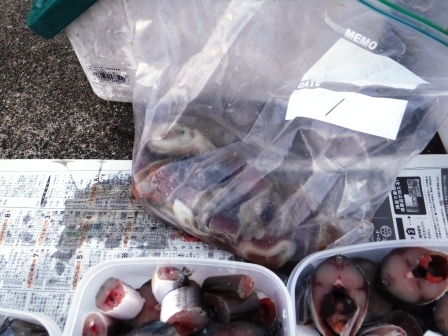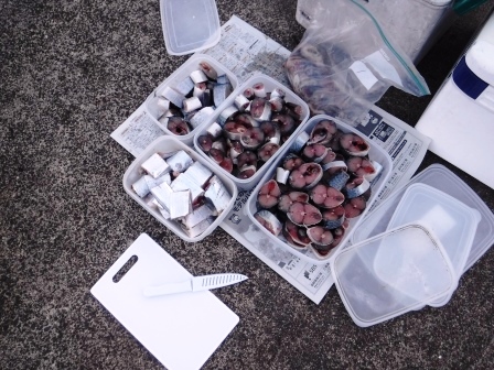 今回のエサはド定番のサバは焼津で釣った細めのものをニコちゃんやビッグマムの大物用に大きめにカット
