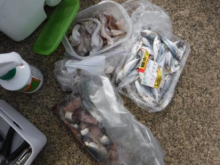 練り餌を付けるのが面倒くさいので、サバやスルメイカに戻して釣ります