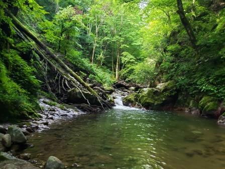 今日は天気が回復して川の水が澄んでくるから釣り人が出てくると思われるので、朝一でメジャーな川へ入る予定でしたが遅すぎるので細い川へ入ります。イワナよりヤマメを釣りたいのでここでやってみます。