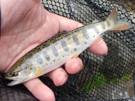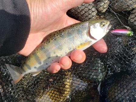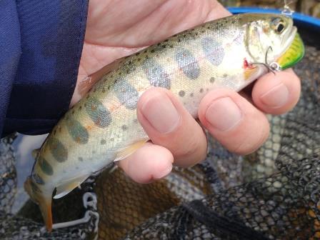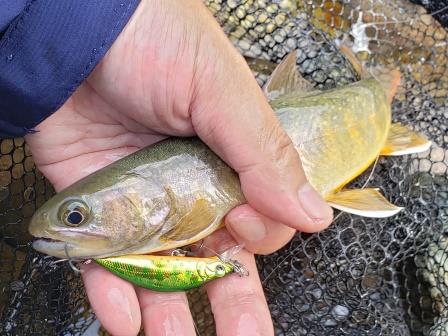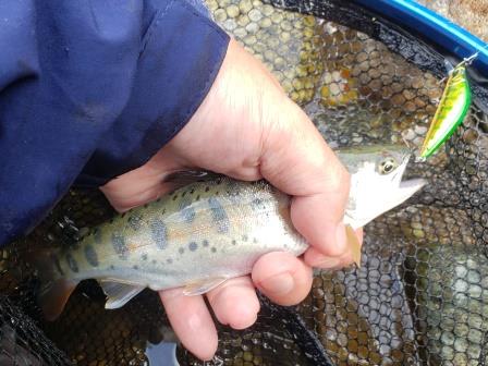 その後、ルアーに反応しない魚がいる淵があったので最近お気に入りのトラウトルアーでボトムを探ってみるヤマメとイワナが釣れる