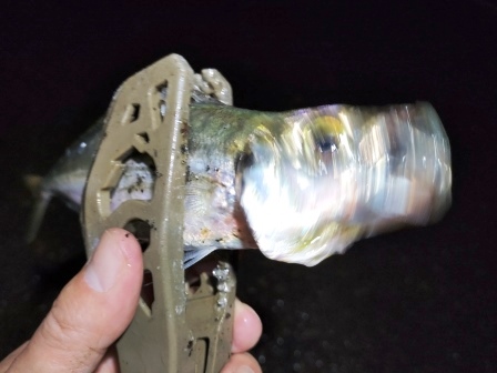 天気が悪いのでいつもより同じ時間でも暗いから釣れそうだ!と思いながらアクションをつけているとカッ!