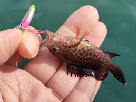 見える範囲に魚がいないので「かめジグ」をセットして探ってみます。
