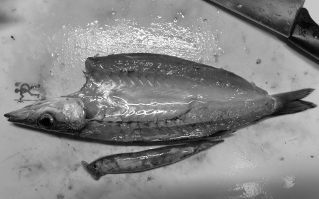 帰宅後、干物にしようと捌いていたらカマスのお腹に大きなイワシ