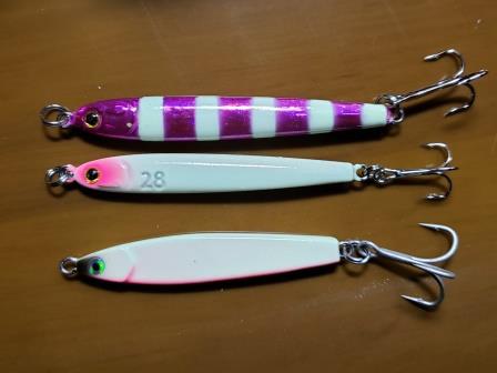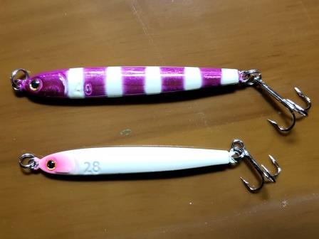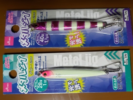 先日、焼津のダイソーで購入したジグです。ゼブラグロー(40g)とフルグロー(28g)ですが、浜のタチにはフルグローを使ってみようかと思っています。