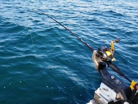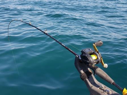 こりゃしょうがないと移動して待っていると、激しくロッドティップが海面に突き刺さる!