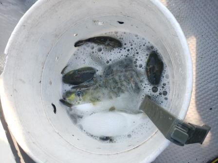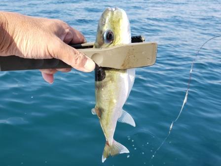 そんな感じでサバフグはまだたくさんいて、群れが来るとエサを付けた仕掛けは落とした直後の水面直下で瞬殺されます。