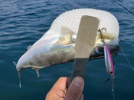 急いで回収しないとハリスを切られます。運良く切られずに水揚げできたサバフグ