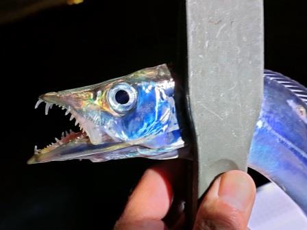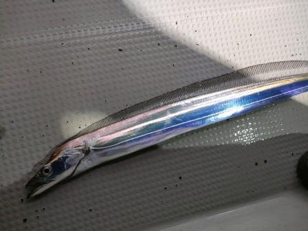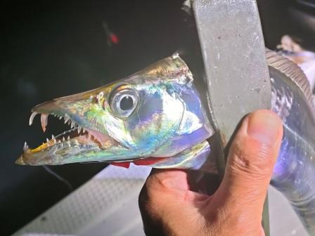 やはり深場のタチは大物だなと、強いファイトを楽しみながら揚げてくると、海面近くで横っ走りします。
