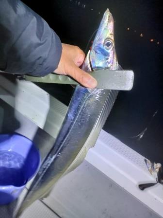 富士山が雪化粧した火曜日、夕方は西寄りの風が吹く浜日和ではありますが、先輩のボートに乗せていただき焼津沖のタチウオへ。