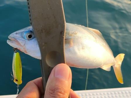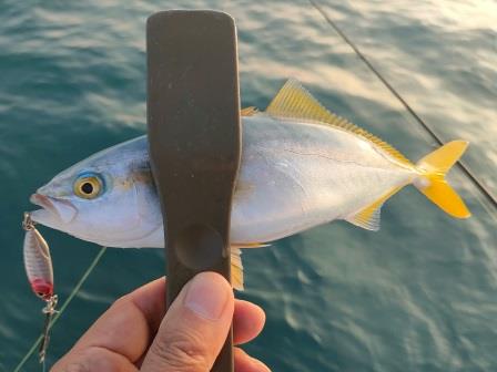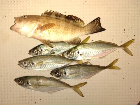 こりゃ厳しそうなので小さいジグをセットして落としながら探ると小さいアジ(25センチくらい)、オオモンハタが釣れて終了。