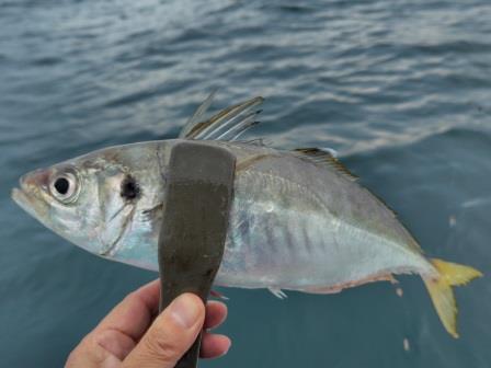 何度も外れた後、やっと釣りあげたアジは良いサイズ