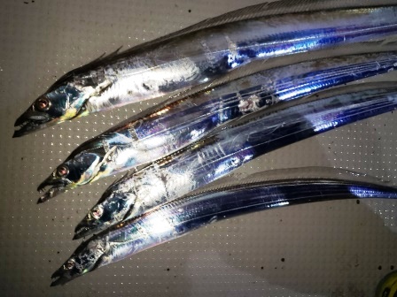 タチウオのお腹からは大きなカタクチイワシ、イカが出てきました。