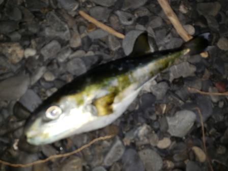 寄せてみるとタチじゃないけど波打ち際では暴れる。揚げてみるとサバフグ(ピンボケw)