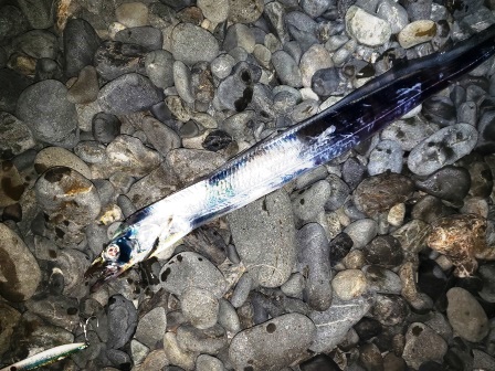 いましたね。暴れるタチウオをバラさないように水揚げ