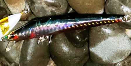 このところタチが比較的近くで釣れることがあるので、ミノーを使ってやろうと買ったことすら忘れていたドルチェ95Sという、ヘッドハンターミノーのような断面が三角の人気のなさそうなものを持ってきました。