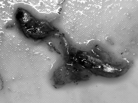 胃の中はほとんど空っぽですけど、ボラッコみたいなのを少し食ってますぜ!